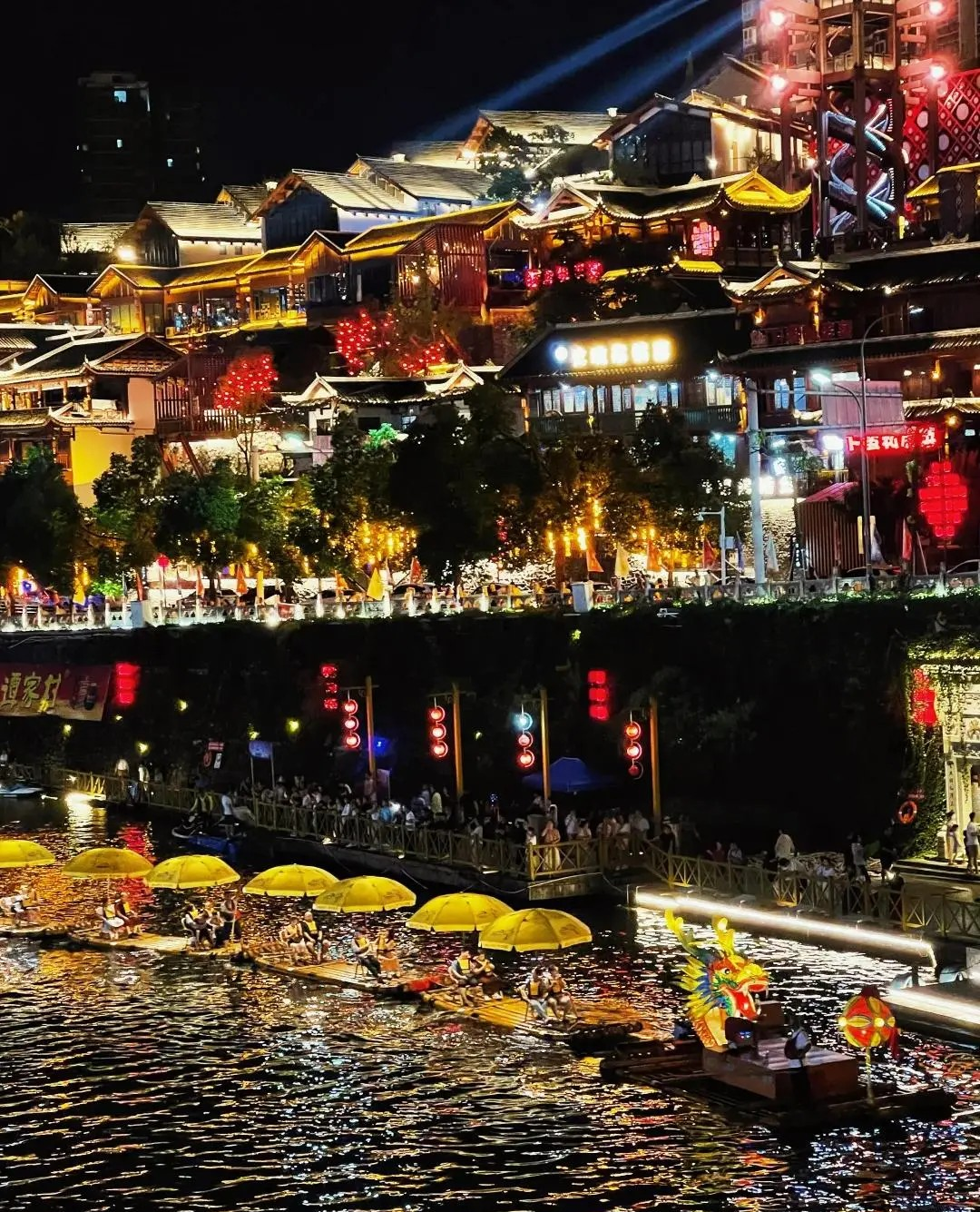 晚上灯光一亮,像极了东方的水城,但又多了一份土家与苗家的原生态味道。吊脚楼倒影在水面上,有点梦幻,有点烟火气。